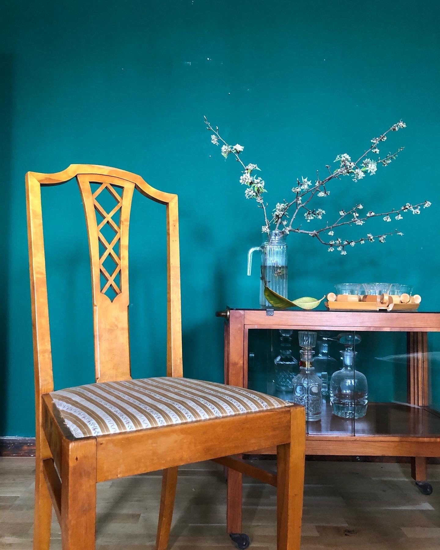 Edler, hochwertiger Polsterstuhl aus Kirschholz. Gepolsterter Sitzfläche, bezogen mit einem glänzenden, edlen Stoff.